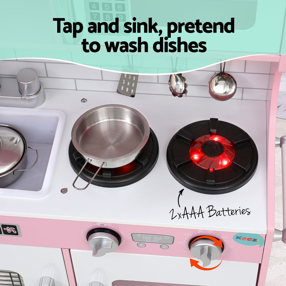 Explore imaginative play with our Keezi Wooden Kitchen Play set. Crafted from sturdy MDF and solid wood with a non-toxic paint finish, it features a smooth surface for easy cleaning. Includes cooking accessories, a fully operational oven door, turntable oven knobs, and a telephone for orders.